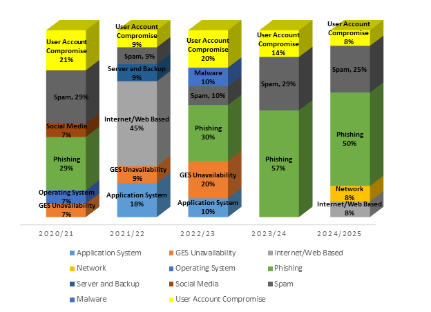 ​​The Automated Information Security Incident Handling System (AISIHS) allows the online recording of ICT security incidents occurring at any governmental department. Incidents per sites have been anonymised for reporting purposes. The summary statistics for incidents as reported at Ministries/Departments for the past financial years are presented below: